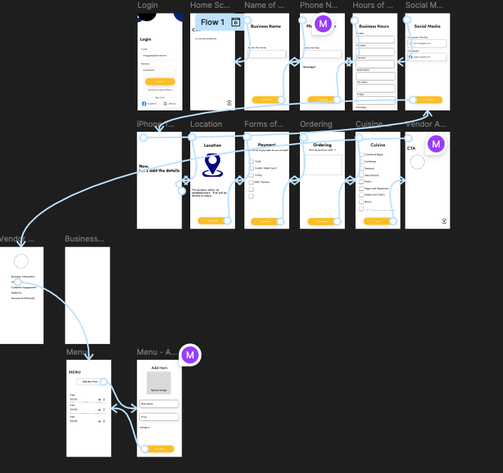 I’ve completed the visual design for the two core MVP features of the app: the Vendor Profile setup and the Menu management flow. This mockup was created in Figma and lays out the vendor’s experience from logging in to fully configuring their business profile.